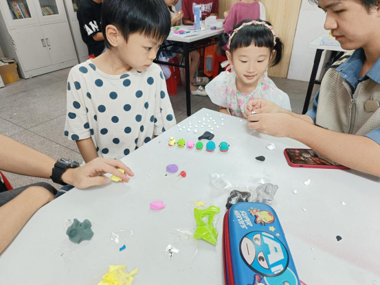为了培养孩子们的动手能力和创造力,梦华之队还组织了手工制作活动。7月9日,成员们提前准备了彩纸、剪刀、胶水,黏土等材料,孩子们动手制作水仙花,黏土蛋糕等。在成员们的帮助下,孩子们认真地剪裁、粘贴,最终完成了一个个精美的作品。这些作品不仅展示了孩子们的创造力和想象力,也让他们体会到了动手制作的乐趣和成就感。手工制作激发了孩子创造力,提升动手能力,增强专注力与耐心,促进孩子们和梦华之队成员们互动。