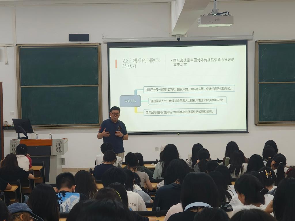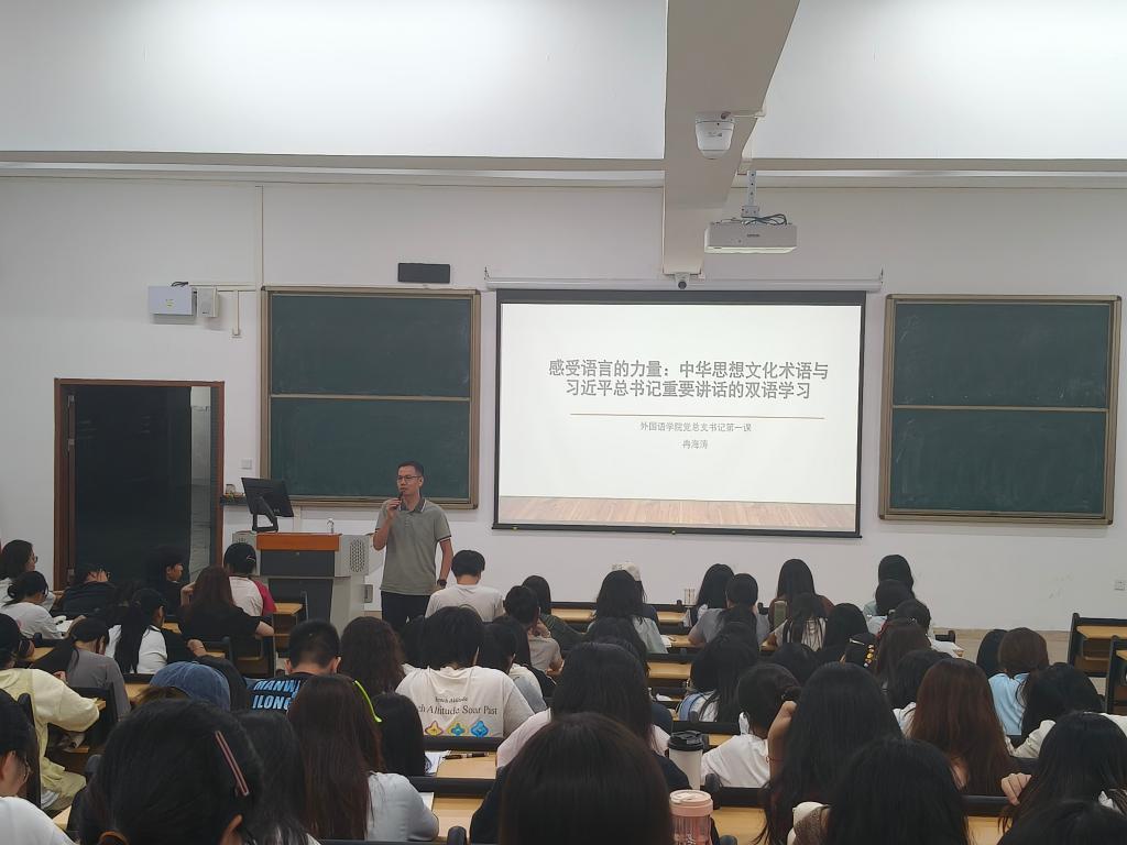 冉海涛书记引用习近平总书记重要讲话,结合中华思想文化术语的时代价值进行论述:“跨文化交际能力不仅是个人发展的核心素养,更是青年担当文化使命的重要基础。”随后,他给同学们提出三点希望:一是厚植文化根基,从“仁义礼智信”等传统术语中汲取智慧,将中华优秀传统文化内化为精神基因;二是树立全球视野,以开放包容心态看待文明差异,在比较借鉴中坚定文化自信;三是践行使命担当,把个人专业学习与国家文化传播需求相结合,成为跨文化交流的“民间使者”。