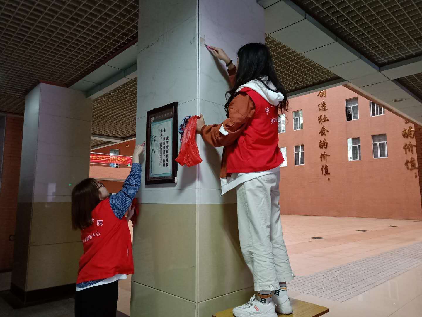 活动中,志愿者们遍布7栋每层教学楼并对每一间教室进行仔细检查,对于在墙上不规范或遗留的粘贴痕迹进行了仔细清理。楼道中,她们遇到了保洁阿姨,她看见大家时激动地说:“谢谢你们,不仅仅减轻了我们的工作负担,还让大家明白清洁工作的不易,更加珍惜和爱护校园环境,真的谢谢你们。