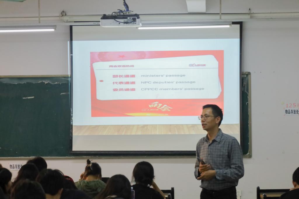 冉海涛书记讲授了题为“外语教育中传统文化的传承与国家意识的培养”的专题课。通过展示上海日报“外媒看中国”的视频——一位在华新西兰媒体人安柏然向世界讲解中国故事,冉海涛书记强调同学们要树立高度的文化自信,增强对中华优秀传统文化的认同感及荣誉感。随后,冉海涛书记带领同学们回顾了两会双语热词。与此同时,他强调用外语“讲好中国故事”,不仅要运用外语,更要学深学透中国文化,才能在文化对比和中外文化交流碰撞中坚定文化自信、不断增强文化认同感。他表示希望同学们能关注国家大事,学好中华文化,深入理解中外文化差异,做好中华文化的传播者。最后,冉海涛书记阐述了外语专业教育的现状,有时候外语专业员工易患“中国文化失语症”,因此外语专业员工应培养文化自觉,树立家国情怀,讲好中国故事,传播好中国声音。