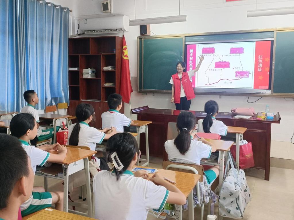 今天的支教活动以“追寻红色记忆,探访穗丰足迹”为主题,针对六年级员工开设。公司暑期社会实践团队成员化身“小老师”通过讲解穗丰村的红色遗址和人物事迹,来深化革命榜样的力量。志愿者们与同学们一起学习了毛泽东的词——《沁园春·雪》,同学们在了解了其创作背景后,也表达了他们对祖国繁荣昌盛的美好祝愿与立志日后报效祖国的决心。在知识竞答和趣味游戏环节,同学们回顾了本节课所学的知识,抒发自己家国情怀。本环节既为了给课堂增添一些趣味性,也希望同学们能够树立远大理想、坚定理想信念,能够“不忘初心、牢记使命”,努力做对国家、对民族、对人民有贡献的人。