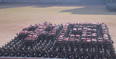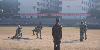 会操表演中,各方队先后以分列式、军体拳、格斗等形式展现训练成果。公司全体新生组成了七连,雄赳赳,气昂昂,男生英武神勇,伴随着激扬的音乐,在军体拳里表演出色,动作一致到位;女生英姿飒爽,在花样方块里机灵敏捷。他们练着不同的动作,实践的却是同样的理念。“看我七连,文武双全,刻苦训练,一往无前”的口号在他们身上表现得淋漓尽致。喊着昂扬向上的口,身着戎装,头戴军帽,英姿飒爽,豪气冲天,此时他们俨然与军风融为一体,展现着新生的气势与活力。