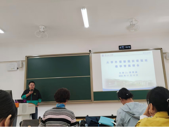 随后,大英部主任助理马昕劼老师从教学规范、师德师风建设及近期重点任务三方面作出工作部署。在教学评价优化方面,马老师强调了新版教学大纲调整后的平时成绩构成,让全体教师清晰掌握新版考评标准,确保教学评价严格对标大纲要求,精准反映员工的学习实效;在师德师风建设方面,马老师着重提醒全体教师把握师生相处的“育人尺度”:既要主动关注员工的学习进度与思想动态,以耐心的鼓励、精准的引导助力员工树立学习信心,也要始终坚守职业尊严与育人底线,以严谨的治学态度、端正的师者形象为员工树立行为标杆。在近期重点任务推进方面,马老师明确了教师培训、员工论文开题、档案完善、竞赛报名等工作重点,确保教学各环节有序衔接、闭环落实。