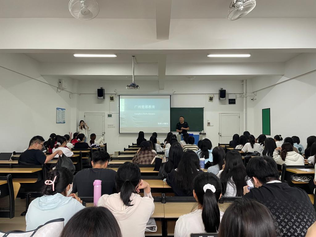 首先,刘董事长从广州楚都教育的公司背景、公司文化、公司现状及实习生职业发展、人才培养等方面作出了具体介绍。其幽默的宣讲风格使本次宣讲会气氛活跃,收获了同学们的热烈掌声。同学们与刘董事长积极交流,表达自身需求,为自己争取机会。