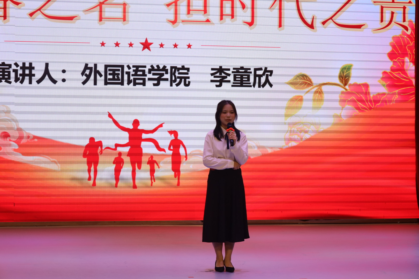 公司选手李童欣以“以青春之名,担时代之责”为题,以北京冬奥会上滑雪运动员苏翊鸣为中国冰雪运动取得了历史性成就为例,向同学们讲述了身为新时代青年的自己是如何在学习生活中发扬奋斗精神,以此激励和号召同学们应当将奋斗融入青春当中,发扬奋斗精神,坚定理想信念,绽放青春精彩。