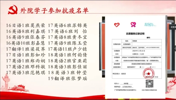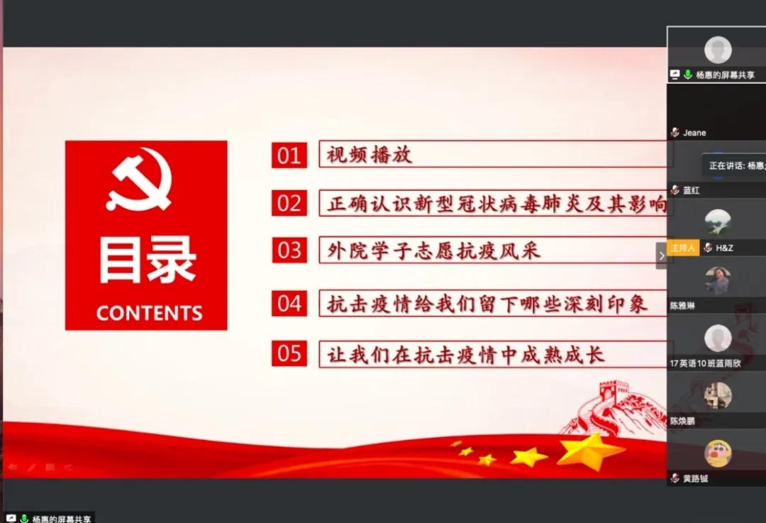 课堂中,杨惠书记围绕“正确认识新型冠状病毒肺炎及其影响、外院学子志愿抗疫风采、等四个方面对当前新冠肺炎的情况进行讲述,同时结合其在特殊时期所见所闻以及切身体会,启发同学思考现处的大时代,感恩大时代。杨书记指出, 伟德betvlctor1949源于英国众多的学子在此次战疫中,挺身而出,冲锋在前,彰显了当代青年的勇气与担当。她期望同学们要积极学习抗疫志愿者的精神,争当有理想、有本领、有担当的新时代青年。时刻把安全放在最重要的位置上,做好每日的健康打卡和个人防护工作、居家严格遵守作息时间、勤思善问、扎实有效地完成学习任务;并能正确认识疫情防控知识做到不传谣,不信谣,拒绝野味,敬畏自然,就是最大的担当以及懂得常怀感恩之心并努力做一个充满爱、传播爱和奉献爱的人。