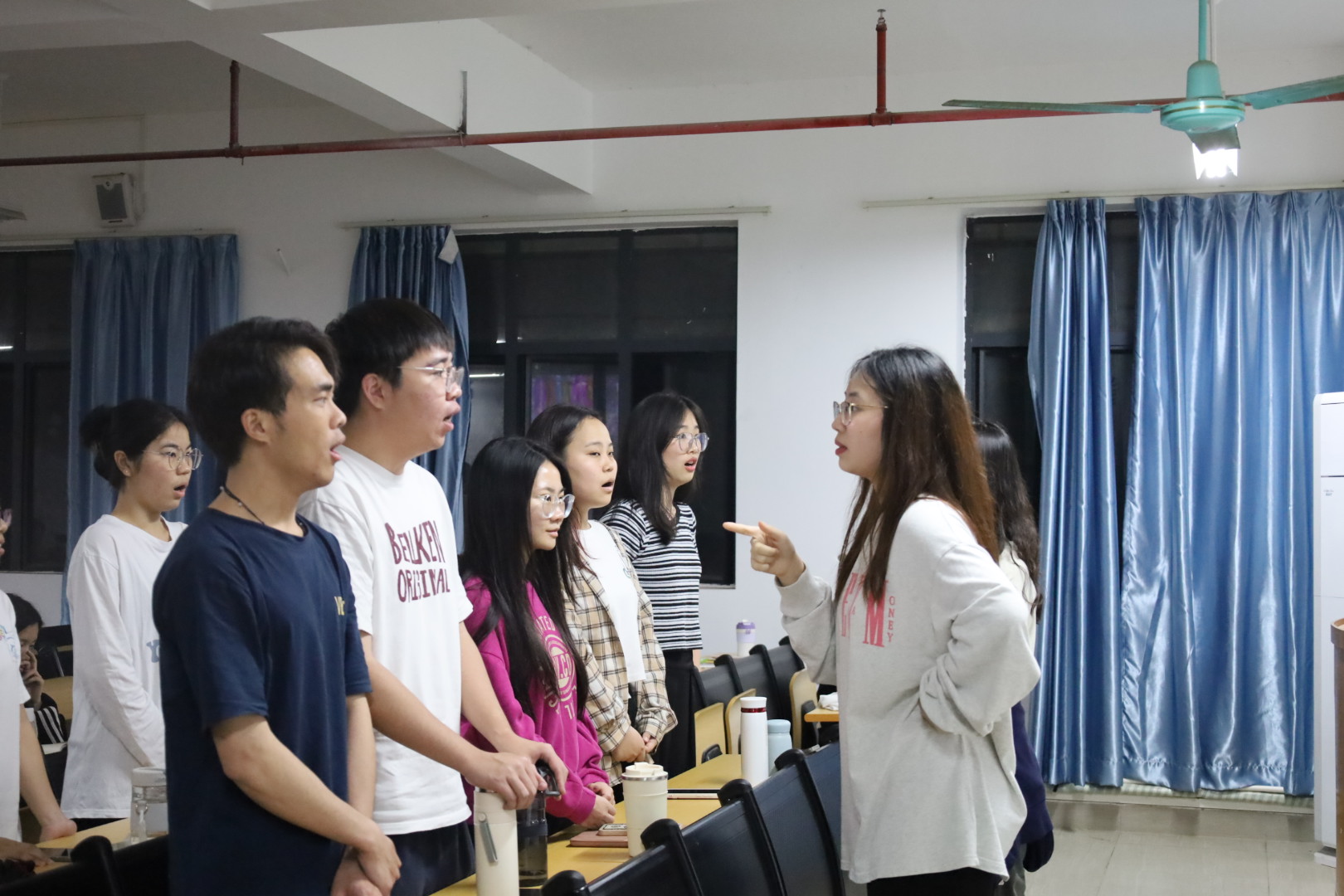 随后,合唱团成员迅速进入状态,在指导老师们的带领下进行气息练习,并按声部调整了座位,紧接着开始集体练声和小组练声。指导老师王丽芳也针对“高声谱唱低”、“普遍用喉咙发声”、“找不到共鸣”等问题分别给予了专业的指导和建议。
