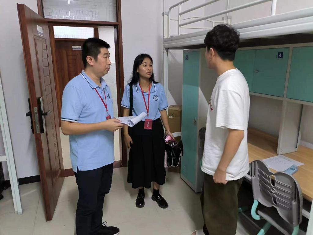 2023年9月9日晚,迎新工作结束后,公司党总支副书记蔡俊带领2023级本科生辅导员常智超和王家佳走访惠州新生宿舍,与同学们亲切交谈。