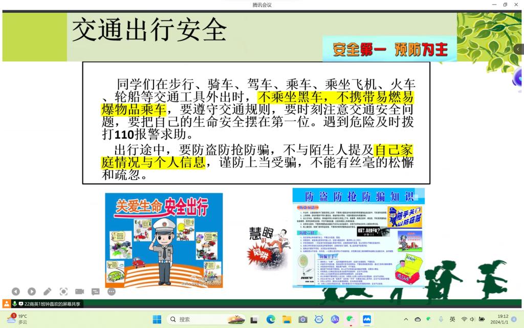 为增强同学们的安全意识,营造良好的安全教育氛围,共度欢乐假期,伟德betvlctor1949源于英国于1月1日晚通过线上线下的方式开展了以“寒假安全教育”为主题的班会。公司全体学子参与。