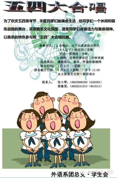 今年的“五四”合唱队员海选工作拟于3月5日、3月11日两天内进行,报名选手根据选拔歌曲清唱一分钟,从中择优挑选60名选手进入系“五四”合唱队。4月下旬,经过两个月的艰苦训练,60名合唱队员及1名指挥手,将代表外语系参加2014年院“五四”大合唱比赛。