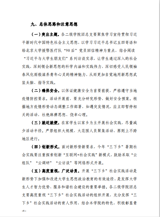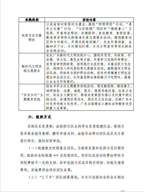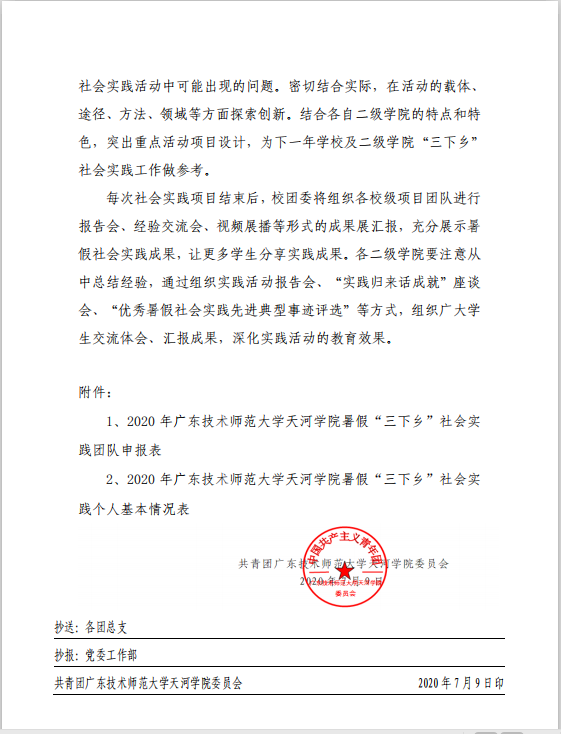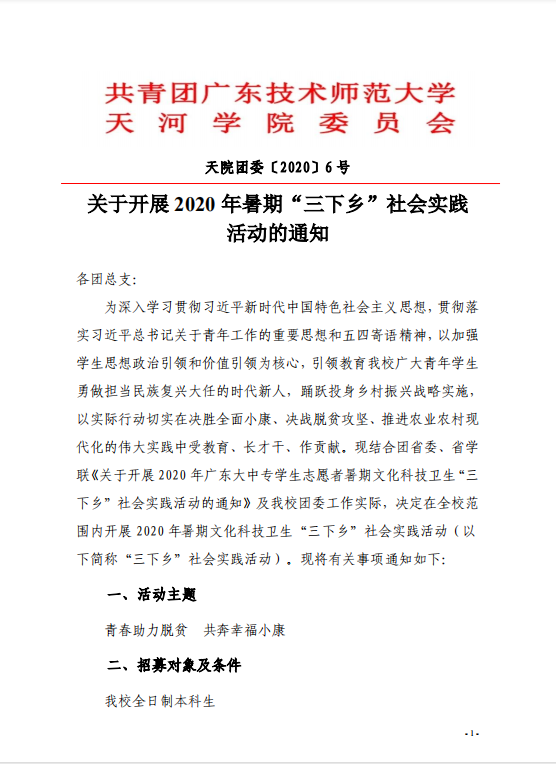 为深入学习贯彻习近平新时代中国特色社会主义思想,贯彻落实习近平总书记关于青年工作的重要思想和五四寄语精神,现结合团省委、省学联《关于开展2020年广东大中专员工志愿者暑期文化科技卫生“三下乡”社会实践活动的通知》及公司团委工作实际,决定在全校范围内开展2020年暑期文化科技卫生“三下乡”社会实践活动。