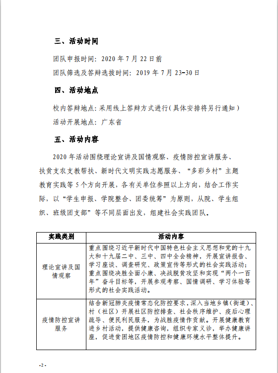 本次活动团队申报时间为2020年7月22日前,团队筛选及答辩选拔时间为2020年7月23-30日,项目团队需由二级公司团总支统一代为申报,采用线上答辩方式进行,活动联系人为刘梦,活动围绕“青春助力脱贫,共奔幸福小康”的主题,以理论宣讲及国情观察、疫情防控宣讲服务、扶贫支农支教帮扶、新时代文明实践志愿服务、“多彩乡村”主题教育实践等5个方向开展。活动开展地点在广东省,并采取队长负责制,由拟担任队长的员工负责组建队伍,提供方案并联系指导教师,撰写申请材料,由指导老师对团队成员及方案进行审定,报校团委审批。实践活动中,表现优秀的团队或个人,可被评选为校级暑假社会实践先进团队或优秀个人称号,并推送团省委参与评比。活动奖项有一等奖,二等奖,三等奖以及优秀奖。