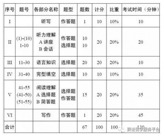 TEM4考试内容分有六个部分:写作、听写、听力理解、完形填空、语法及词汇、阅读理解。整个考试需时130分钟。