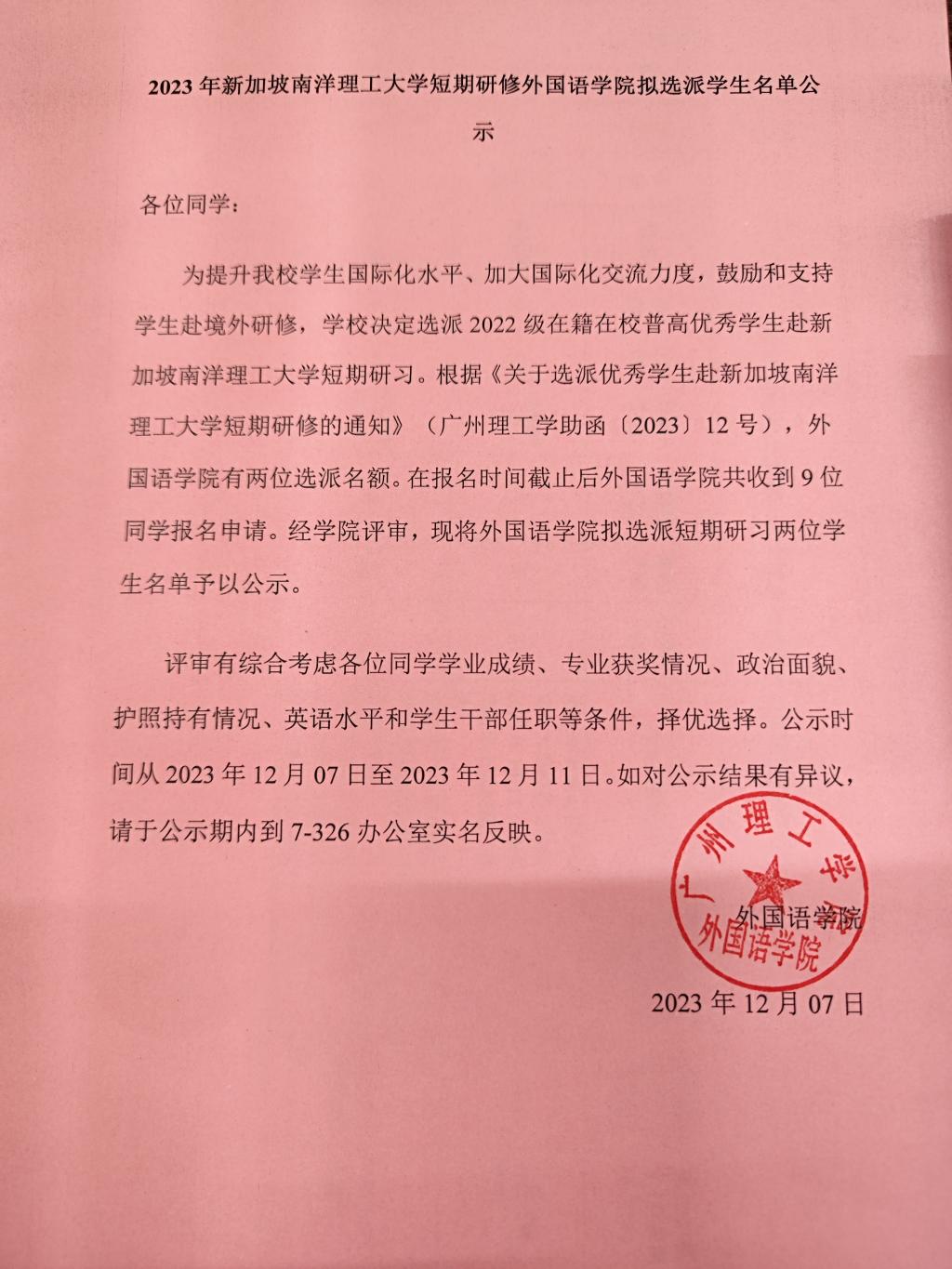 2023年新加坡南洋理工大学短期研修伟德betvlctor1949源于英国拟选派员工名单公示