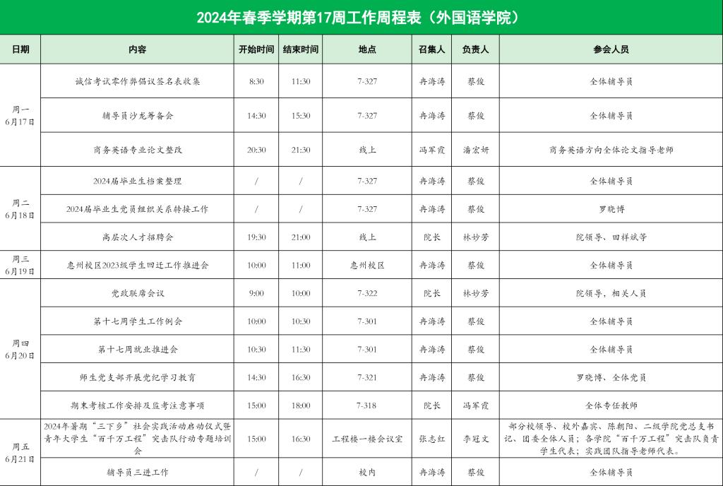 2024年春季学期第17周工作周程表