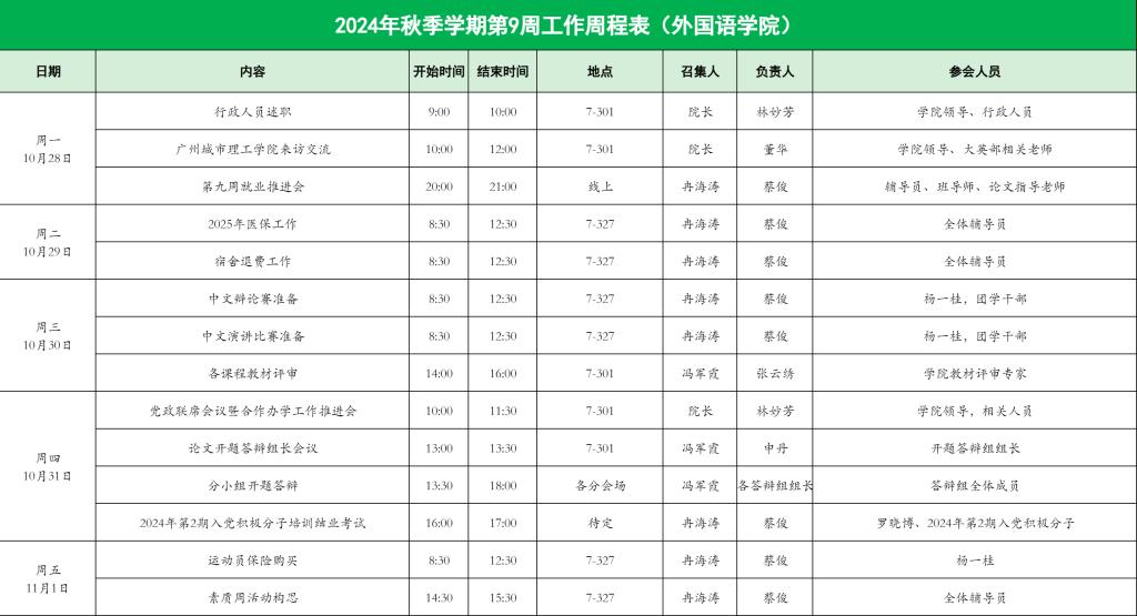 2024年秋季学期第9周工作周程表