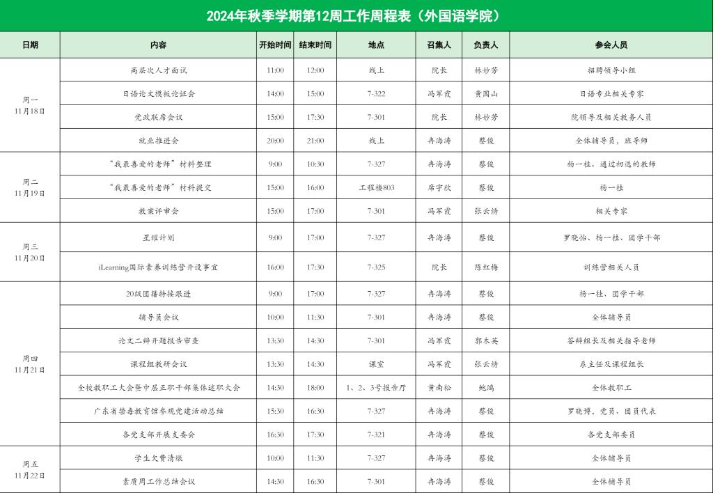 2024年秋季学期第12周工作周程表