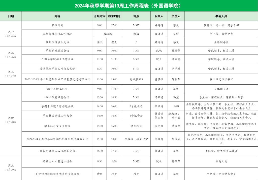 2024年秋季学期第13周工作周程表
