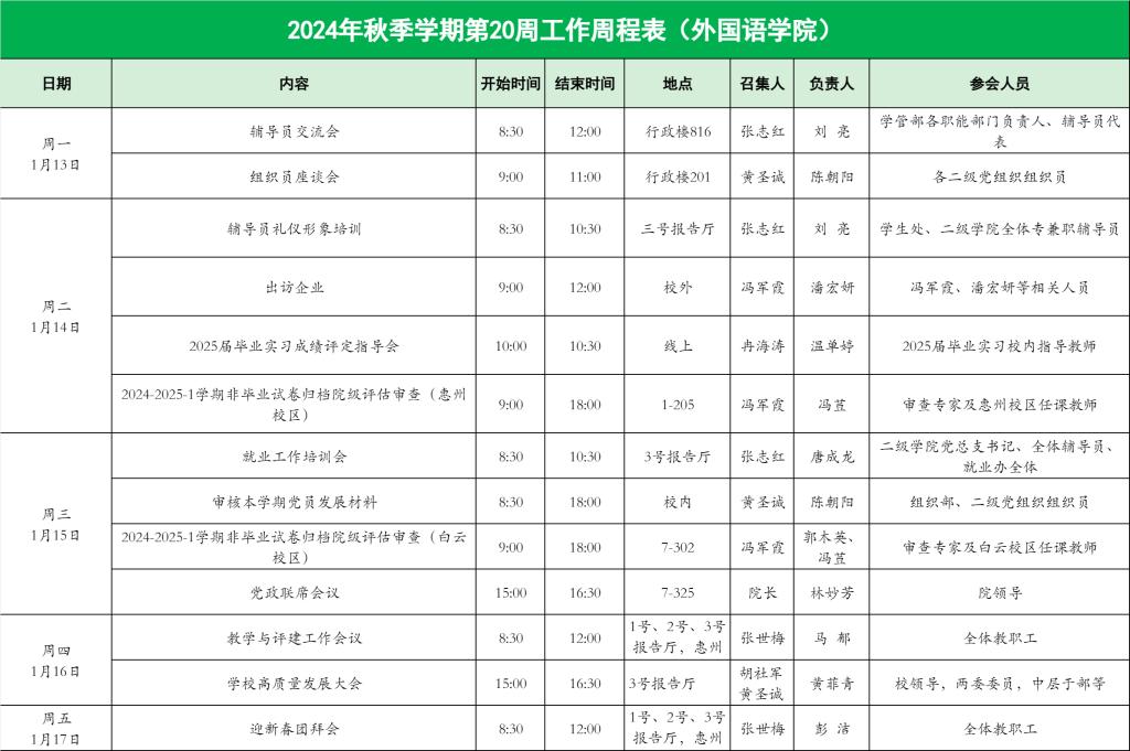 2024年秋季学期第20周工作周程表