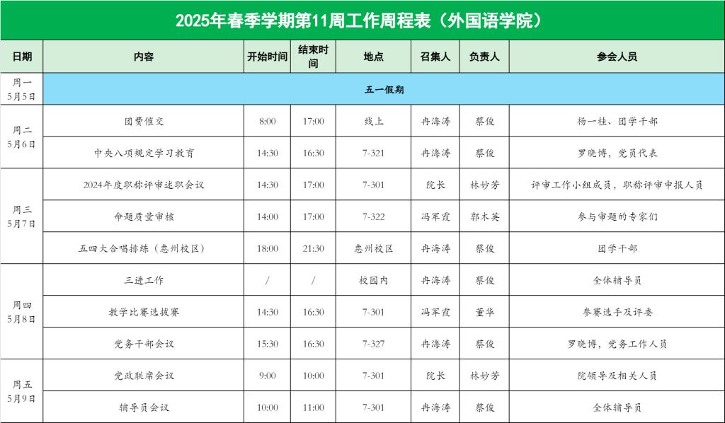 2025年春季学期第11周工作周程表