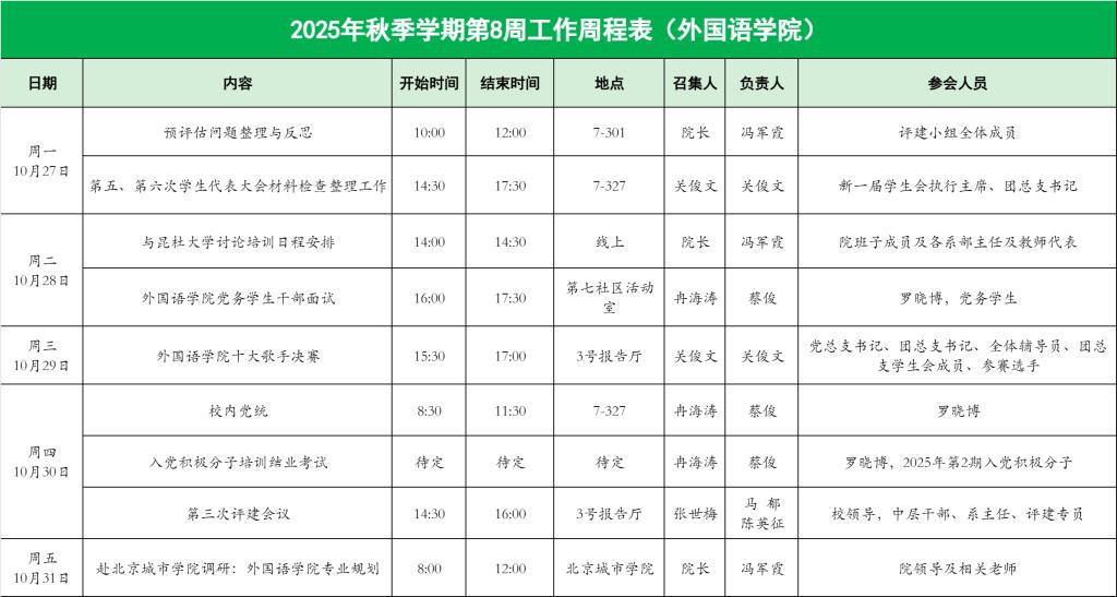2025年秋季学期第8周工作周程表