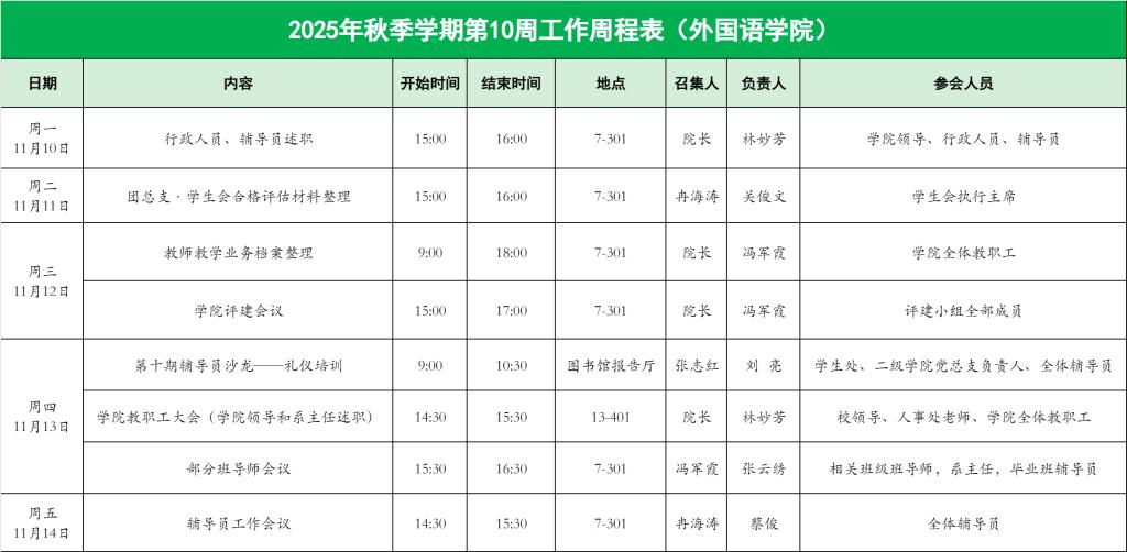 2025年秋季学期第10周工作周程表