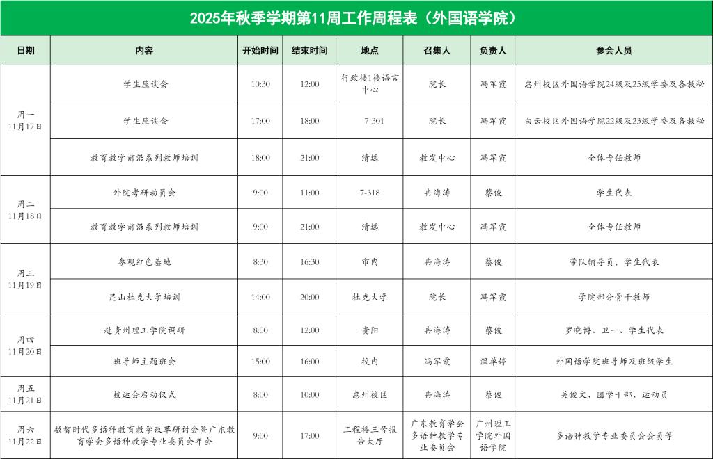 2025年秋季学期第11周工作周程表