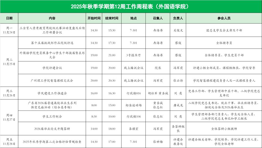 2025年秋季学期第12周工作周程表