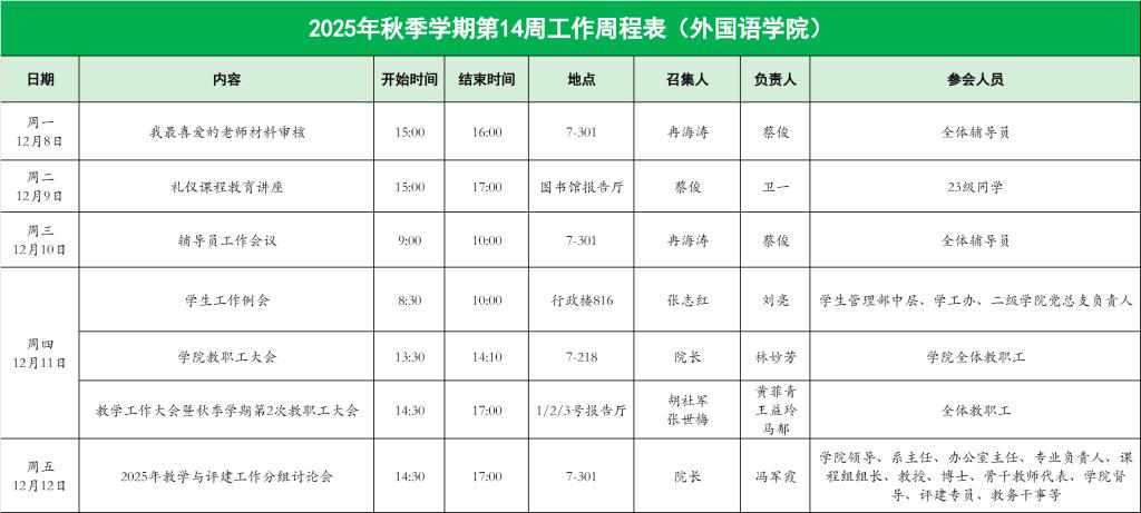 2025年秋季学期第14周工作周程表
