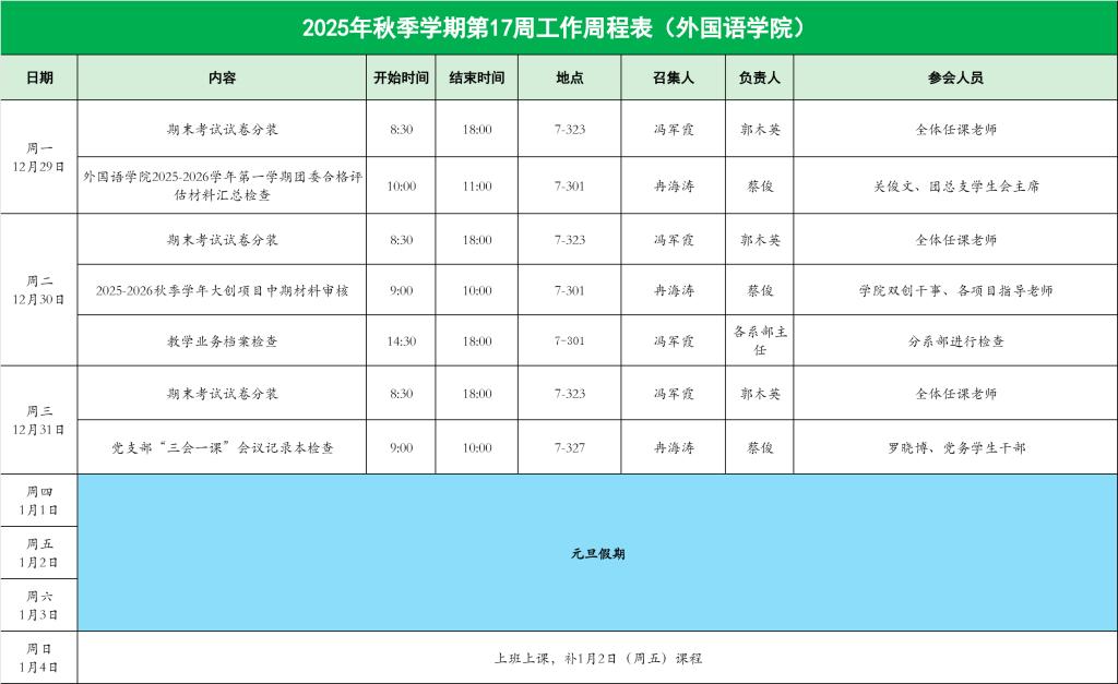 2025年秋季学期第17周工作周程表