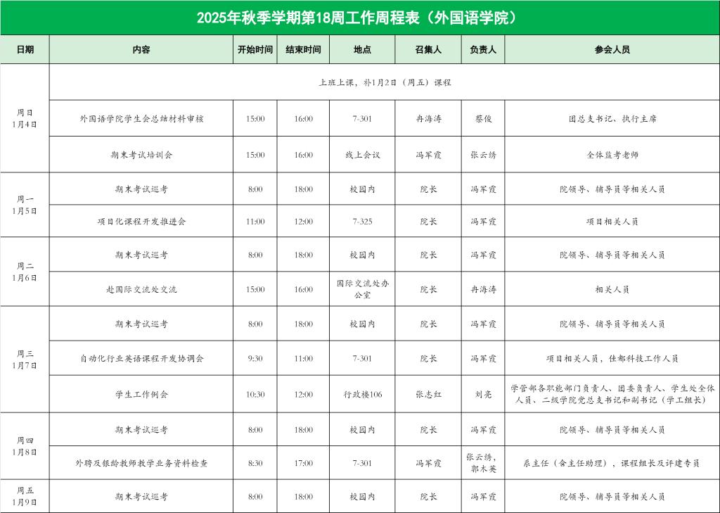 2025年秋季学期第18周工作周程表