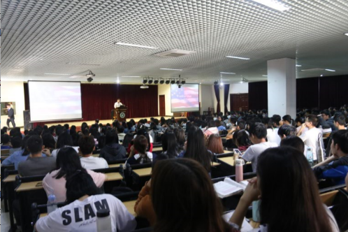 Ashley Hurst博士从美国的地理位置、人文环境、饮食气候、各地语言特色等方面进行阐述,让同学们对美国的生活与文化有了总体的了解。Ashley博士的讲座生动活泼,六栋报告大厅座无虚席,同学们听得聚精会神。演讲结束后,同学们踊跃提问,现场气氛活跃。不少同学在讲座结束后与Ashley博士互留联系方式,合影留念。