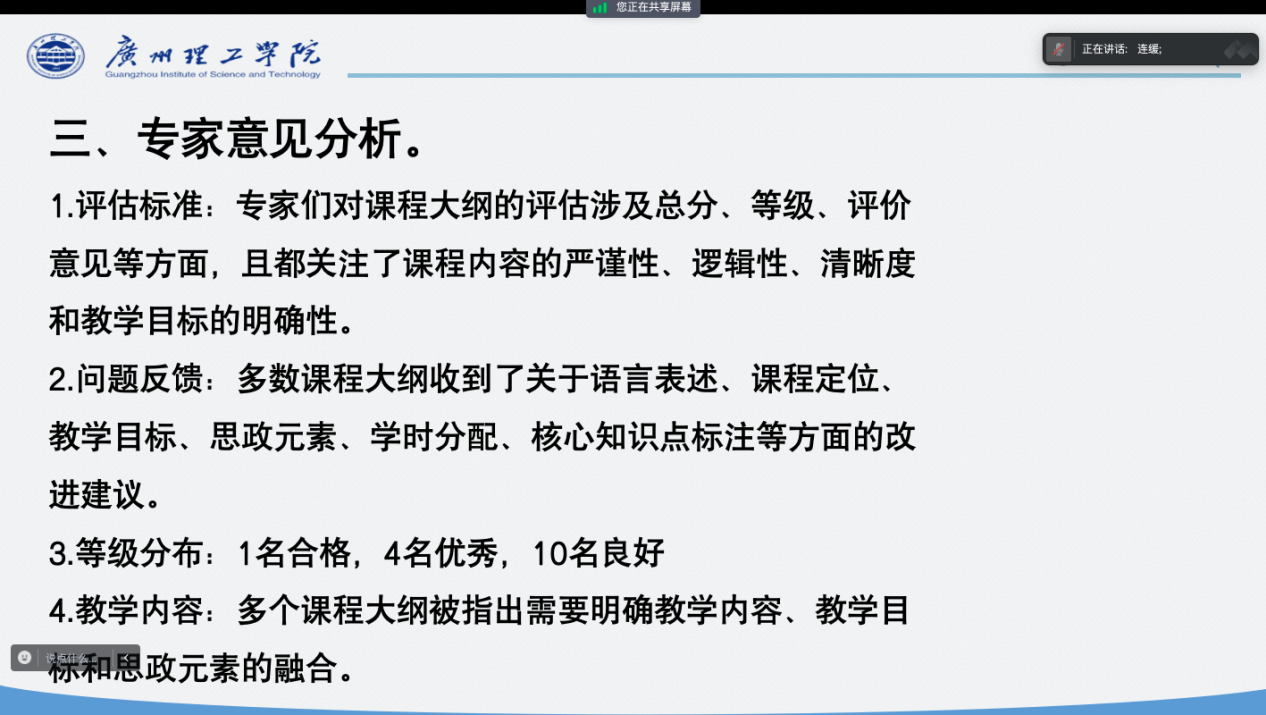 最后,冯院根据专家反馈的意见进行了总结。她从评估标准、问题反馈、等级分布、教学内容这几个方面和各位老师进行了分享。她强调修订教学大纲是一项长期而艰巨的任务,需要全体教师的共同努力和持续探索,希望大家能够以此次会议为契机,进一步加强交流与合作,共同推动公司教学质量的提升。