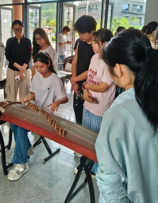 在实践教学环节,两位指导老师采用一对一指导模式,对每位同学进行精准辅导。钢琴课堂上,卢雯靖耐心调整员工的坐姿与手型,细致讲解指法发力要点;古筝区域内,刘知越亲手示范指甲佩戴技巧,手把手纠正拨弦角度。通过悉心指导,同学们从单音练习逐步进阶到连贯演奏,生疏的琴音与筝声渐趋流畅,现场洋溢着专注与探索的氛围。