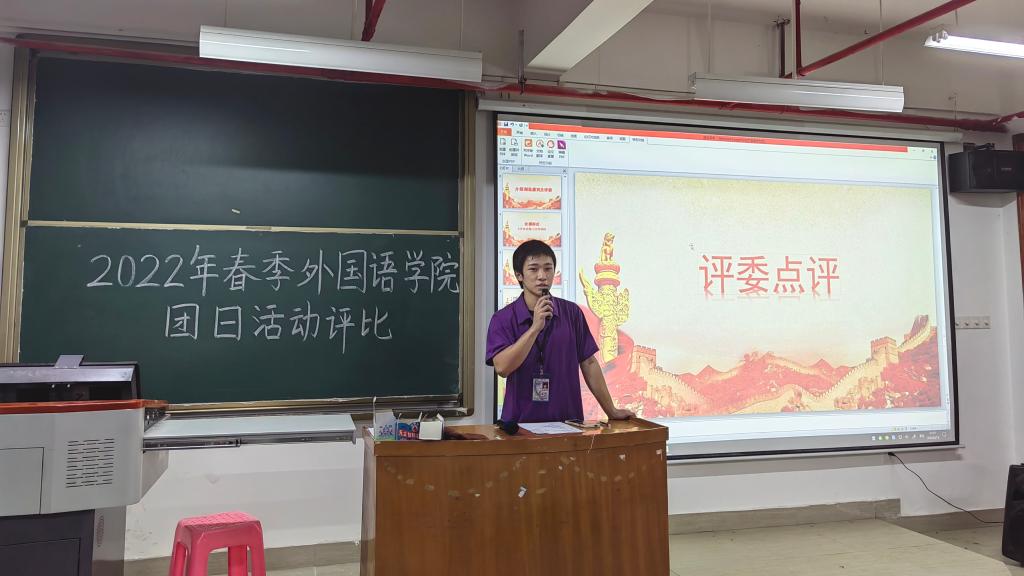 团总支组织委员黄泳康点评本场比赛。他指出,我们应该着重关注主题部分,提倡用英语结合党史的知识一起讲解,丰富内涵,也可以结合公司具体情况,贴近生活实际;希望广大青年勇担时代使命,不负青春韶华。