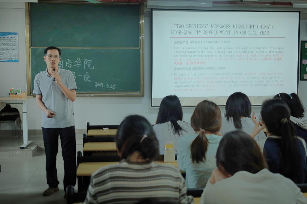 会议伊始,韩经理以“坚守文化自信,讲好中国故事”为主题,从文化自信的内容、中国故事的内涵、坚定文化自信与讲好中国故事的关系、如何讲好中国故事、为何要讲好中国故事以及作为外院人如何讲好中国故事六个方面入手,为同学们生动而细致地讲述了作为新时代的青年学子,应该如何坚定文化自信,讲好中国故事。接着,韩经理结合自身经历,希望同学们深入学习中华优秀传统文化,在参与文化交流活动的过程,增强民族自豪感和凝聚力,促进文化交流与合作,推动中华文化走向世界舞台。最后,韩经理讲述了公司在培养具备国际视野和专业技能的外语人才方面所作出的努力,强调公司注重员工语言实际运用、跨文化交际及创新思维能力的培养,以适应全球化市场对人才的需求。