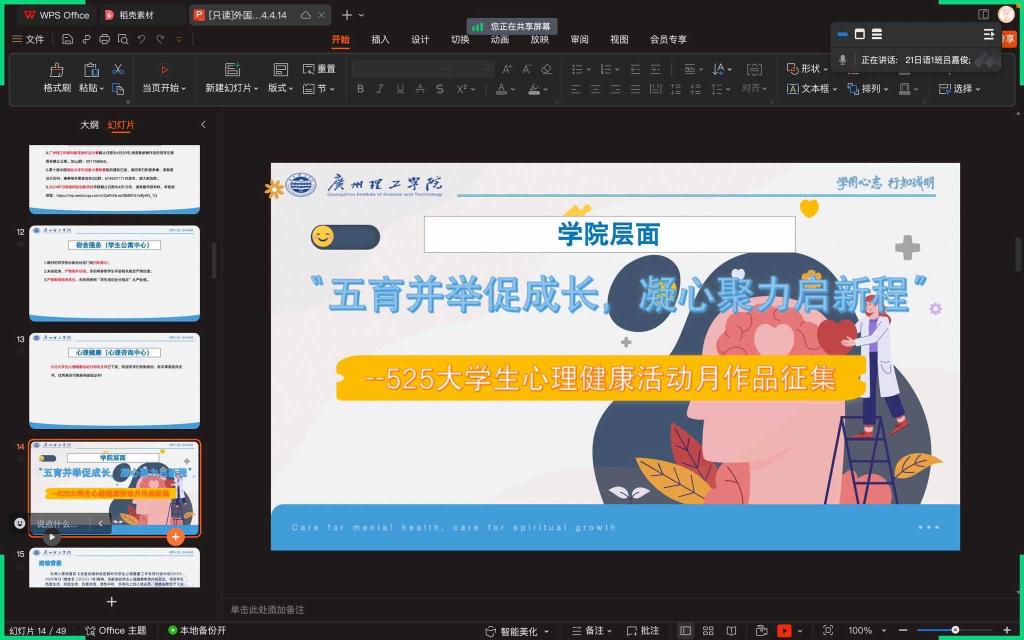 会议伊始,各班班委围绕“五育并举促成长,凝心聚力启新程”主题,向同学们讲解了此次心理活动月的五个项目——“随心所绘,以画抒心”心理绘画征集活动、“拾光于心,剧焦青春”心理情景剧征集活动、“音传千里,言入人心”心理健康主题演讲征集活动、“视说心语,频见真情”心理科普短视频征集活动以及“微光演绎,课展心声”心理微课征集活动,倡导同学们积极参与此次活动,重视心理健康发展,从而在参与活动的同时学习更多心理知识,关注自身心理状态,健康成长。
