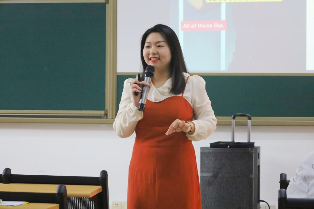 专场分享在热烈的欢呼声中开展。教学总监苏钰颖从“探究语言发音学习奥秘”、“剖析地道英语的发音特点”、“如何走出英语发音、口语的误区”三方面进行详细阐述。苏总监谈到改善发音时,建议同学们了解和掌握英语语流中的音变和韵律特征节奏,加强对连读、同化、失去爆破、句子重音、弱读、停顿的掌握,同时克服一些不良的发音习惯。苏总监充满激情的讲解及其幽默的教学风格使在座员工学习兴趣高涨。随后,公司已入职的学子邹玉林和郭美林给在座同学们表演了一段充满激情的英语秀,以风趣幽默的语言和灵活有趣的方式带动同学们积极互动,将分享会的氛围推向另一个高潮。最后,苏总监结合自身经历和丰富例句向同学们介绍了自然拼读法和读音规则两种记忆单词方法,在互动中强化了同学们对知识的吸收和掌握。同时她还针对单词发音要领和句子朗读技巧为公司学子进行讲解与指导,帮助其更轻松、高效地提升英语语音语调。