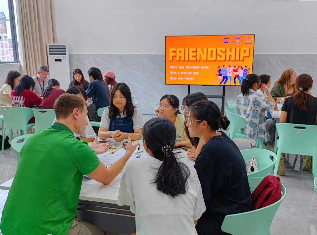 活动伊始,主持人李帆详细地介绍了活动流程。通过一系列趣味破冰游戏,外教和助教们迅速点燃了现场氛围。大家在欢声笑语中拉近了距离,消除了陌生感。随后,各小组围绕友谊主题展开热烈讨论,分享了对友谊的感悟,并共同创作出一幅“友谊树”。每位同学在树上绘制自己眼中友谊的要素,形成了一幅色彩斑斓、充满温情的友谊画板。